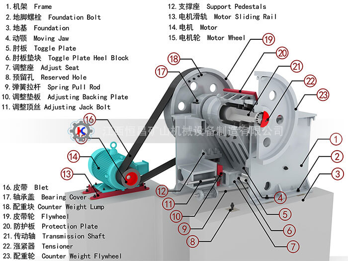 顎式破碎機主要由機架、偏心軸、大皮帶輪、飛輪、側(cè)護板、肘板、肘板后座、調(diào)隙螺桿、復(fù)位彈簧、固定顎板與活動顎板等組成。
