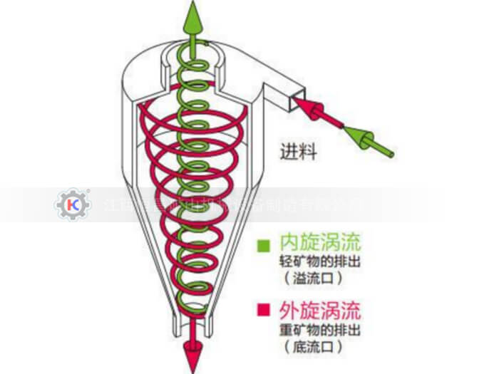 水力旋流器的工作原理是離心沉降原理。當(dāng)需要分離的礦漿以一定壓力從旋流器周邊切向進(jìn)入旋流器內(nèi)后,產(chǎn)生強(qiáng)烈的三維橢圓型強(qiáng)旋轉(zhuǎn)剪切湍流運(yùn)動(dòng)。由于粗顆粒與細(xì)顆粒之間存在粒度差,其受到離心力、向心浮力、流體曳力等大小不同,受離心沉降作用,大部分粗顆粒經(jīng)旋流器底流口排出,而大部分細(xì)顆粒由溢流管排出,從而達(dá)到分離分級(jí)目的。