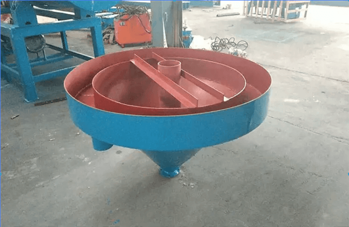 分泥斗又稱圓錐分級機,是一種簡單的分級、脫泥及濃縮用設備。它的外形為一倒立的圓錐。在液面中心設置給礦圓筒,圓筒底緣沒入液面以下若干深度。礦漿沿切線方向向給入中心圓筒,經緩沖后由底緣流出。流出的礦漿呈放射狀向周邊溢流堰流出。在這一過程中,沉降速度大于液流上升分速度的粗顆粒將沉在槽內,并經底部沉砂排出。細顆粒隨表層礦漿進到溢流槽內。給礦粒度一般小于2mm。分級粒度為75μm或更細些。