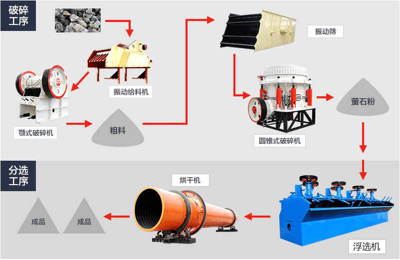 螢石礦的選礦工藝需根據礦石性質以及客戶要求精礦品位等多方面的因素制定,一般要求冶金級螢石精礦的選礦只需經過手選,重選即可,對于酸級化工行業用螢石精礦粉的制取需要采用浮選的方法獲得,該工藝通過手選,重選,浮選聯合工藝處理螢石礦,具有較強的代表性